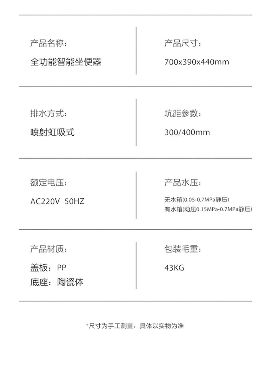 商品屬性 [尺寸] 700×390×440mm [坑距] 305mm [沖水模式] 噴射式虹吸
