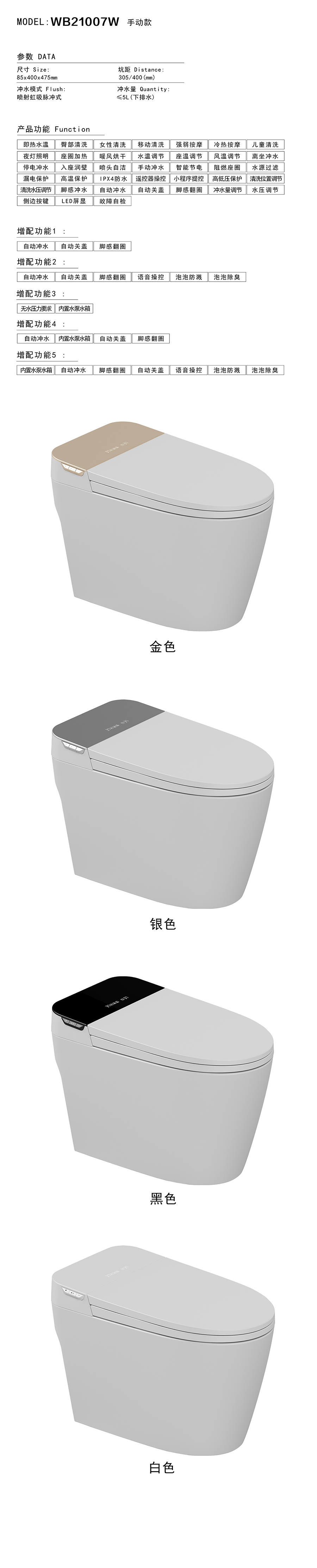 商品屬性 [尺寸] 85x400x475mm [坑距] 305/400 [沖水模式] 噴射虹吸脈沖式 [噴水量] ≤5L