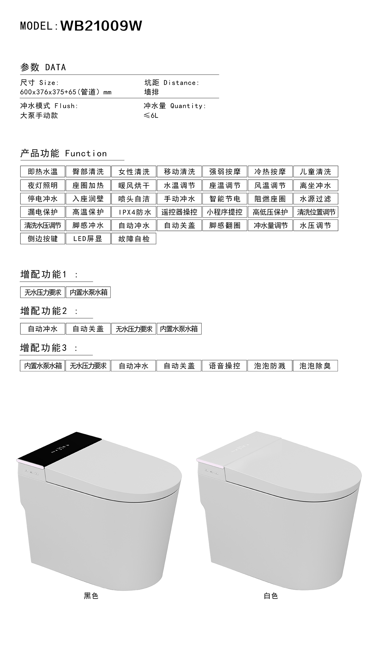 商品屬性 [尺寸] 600x376x375+65(管道)mm [坑距] 墻排 [沖水模式] 大泵手動款 [噴水量] ≤6L