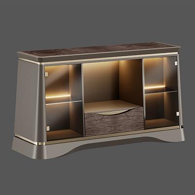 基材采用國企上思華林先進生產線 E0級別高密度纖維板,表面貼高檔 樹瘤木皮+瑪瑙灰水性金屬漆,五金: 拉手,DTC導軌,可見層板底部都暗 藏平面LED鋁條燈帶,人體感應開關, 自然光照