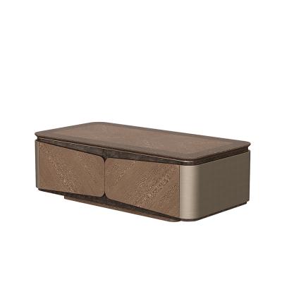 基材采用國企上思華林先進生產線E0級別高 密度纖維板,表面貼高檔尼斯影木木皮,內裝 飾板為高光貓眼木皮,外側板外捫金絲皮。 頂板底部配有SUS304不銹鋼實芯裝飾條,表面 鍍成高貴的玫瑰金顏色,更顯高貴典雅。茶幾 結構帶兩個抽屜。