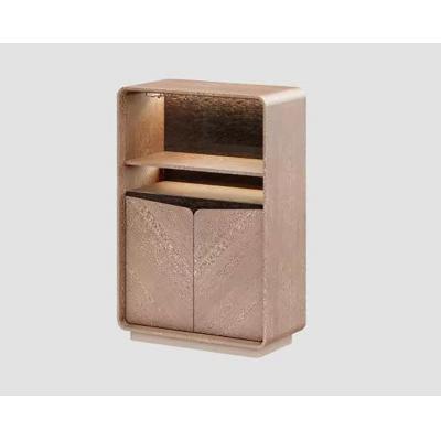基材采用國企上思華林先進生產線E0級別高 密度纖維板及實木多層彎板,表面貼高檔尼斯 影木木皮,背板為高光貓眼木皮,可見側、層 板外捫金絲皮。可見層板底部都暗藏平面LED 鋁條燈帶,人體感應開關,自然光照,完美表 現尼斯和貓眼兩種相輔相成的木皮及產品造型 的層次感